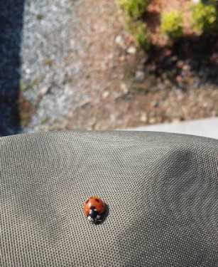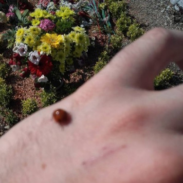 Heute morgen als ich am Grab meiner Mama stand (ich gehe fast jeden Tag) ich habe etwa gemerkt auf meinem Rucksack, der auf dem Bodem , direkt vor dem Grab stand...... es war ein schöner Marienkäfer, die sofort auf meinem hand kam und dort lange blieb, als ich das Handy im Rucksack nahm um ein Bild aufzunehmen.....nach einige Minute ich habe den Marienkäfer auf dem Grabstein hingestellt..... ich war so froh...... vor einigen Monate ich hatte am Grab eine ähnliche Erfahrung mit einem Schmetterling...... aber diesmal war noch besser, weil ich hatte nie früher Marienkäfer in dem Friedhof gesehen und weil sie so lange auf meinem Hand blieb und ganz ohne wegzuflieben..... ich weiß auch nicht als sie auf meinem Rucksack landete...... hier die 3 Bilder, auch wenn die 3. nicht klar ist ich wollte mit diesem nur zeigen dass er nicht nur auf meine Jacke aber auch in Hand lange blieb.....
