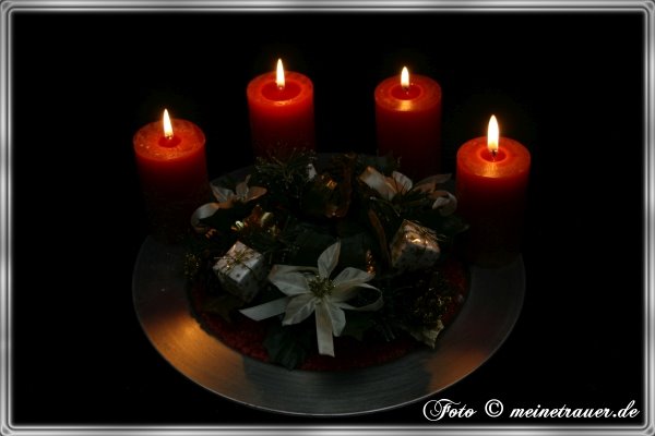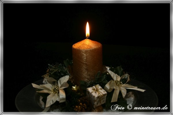 Für die Anderen ist es leicht zu sagen: "Es wird schon werden!", "Es sind Tage, wie jeder andere!", "Kopf hoch, es wird schon nicht so schlimm sein, hast ja Deine Familie um Dich!" usw. Ich habe meine Familie, für die ich sehr dankbar bin. Das eine kann aber das andere nicht ersetzen! Ich hatte die Zukunft mit Dir geplant! Mit Dir wollte ich alt werden und noch so viele Weihnachten verbringen.....