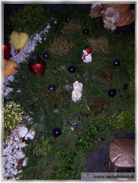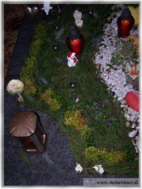 Das Grab mit Tannenzweigen bedeckt, ein paar Kugeln auf Dein Grab gelegt. Ein kleiner Weihnachtsbaum wurde von mir auf Dein Grab gestellt und geschmückt. Leise Weihnachtslieder gesungen oder eher vor mich hin gesummt. Eine Tasse Kakao zum aufwärmen, gegen die Kälte trank ich und vergoss sehr viele Tränen.