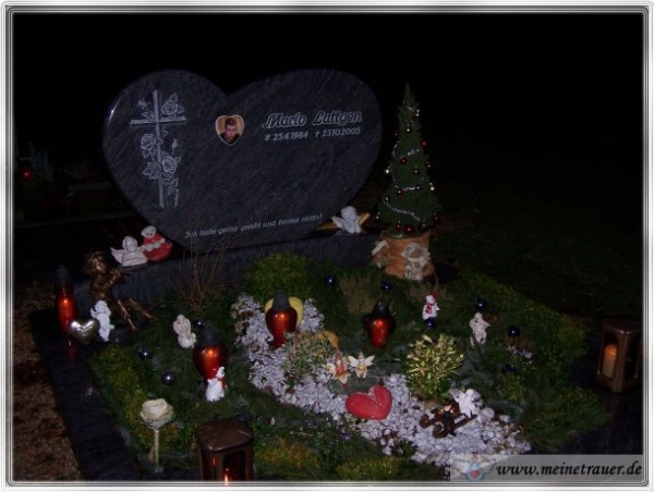 Am Grab angekommen, vergoß ich weitere Tränen und zündete über 30 Kerzen an. Das Grab sollte leuchten. In mir kehrte Ruhe, innerer Frieden ein. Ich blieb am Grab und schaute den Kerzen zu, wie sie mir in der Dunkelheit Licht gespendet haben. Dann sagte ich laut: "Frohe Weihnachten Schatz, egal wo Du jetzt bist, ich fühle, dass Du tief in meinem Herzen bist und der Tod kann unsere Liebe nicht beenden. Ich wäre gerne jetzt bei Dir, aber was bringt es denn, mein Leben zu beenden, damit Weihnachten meine Mutter, meine Familie am Grab stehen und weinen?"