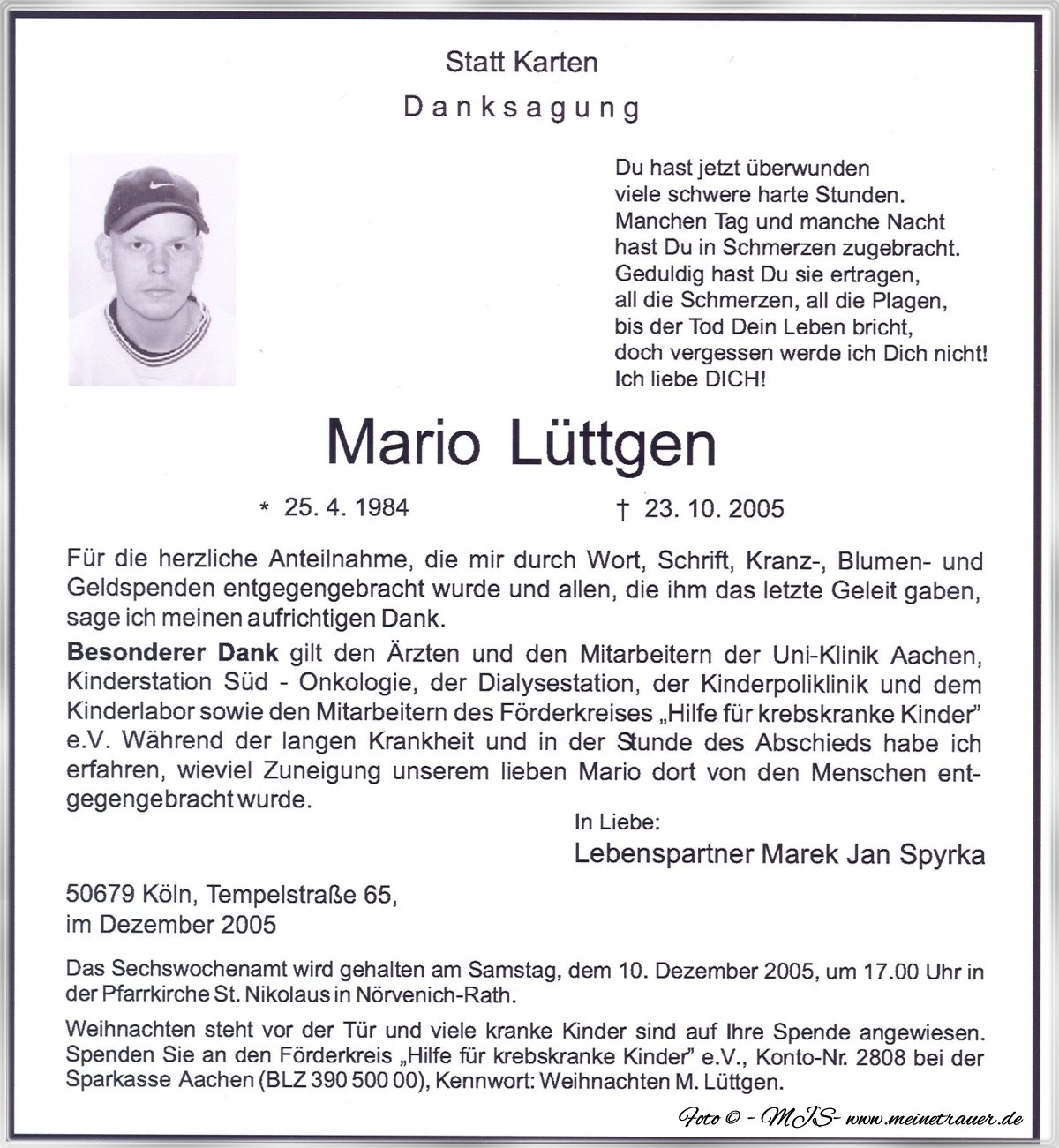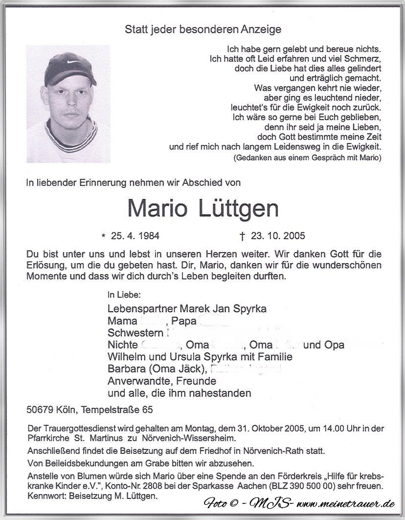 Zuhause angekommen setzte ich mich an den PC und entwarf die erste Traueranzeige. Sendete diese Marios Vater zu, weil ich nicht wusste, wer alles in der Anzeige erwähnt werden sollte und welcher Spruch passend wäre. Ich bekam eine Antwort, mit einem Vorschlag, den ich dann noch überarbeitet habe und nun war die Anzeige auch soweit fertig für den Versand per E Mail an den Bestatter.