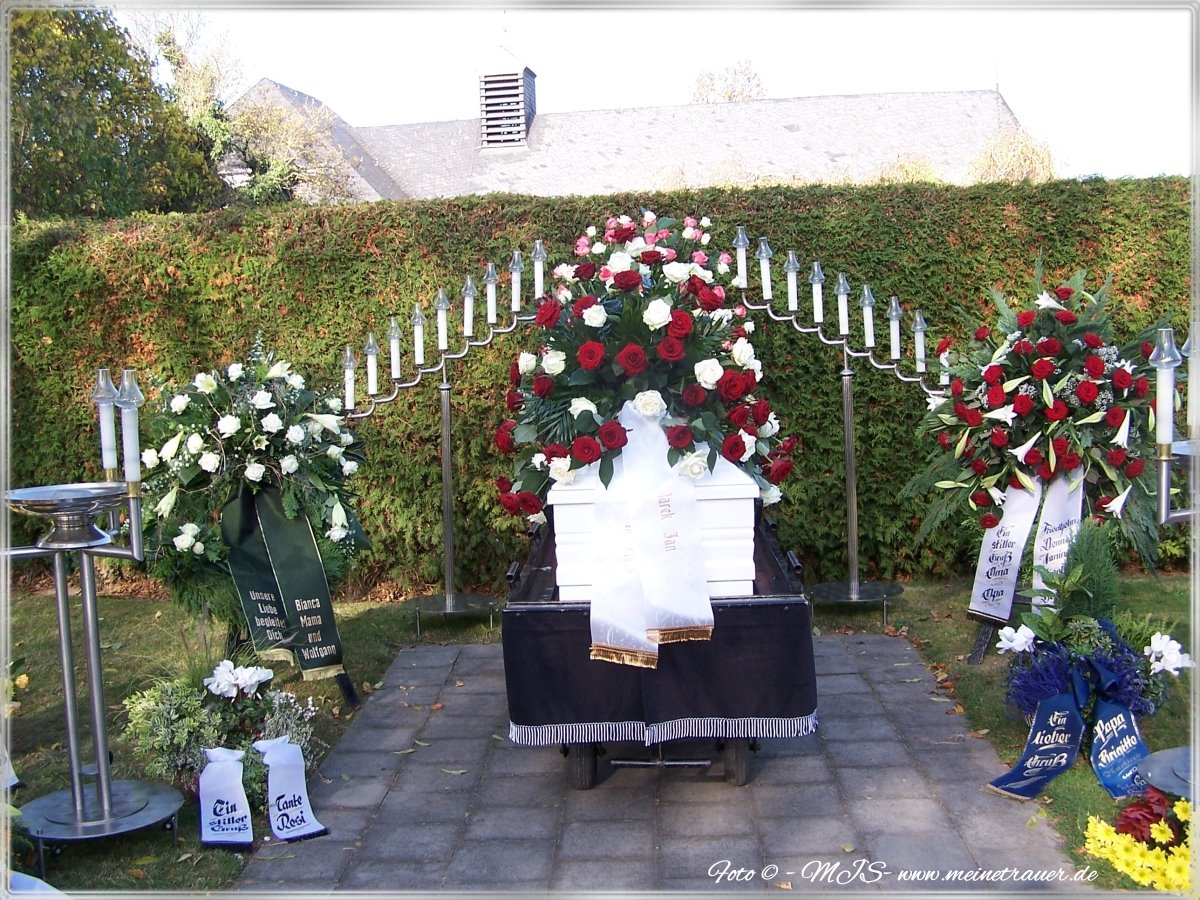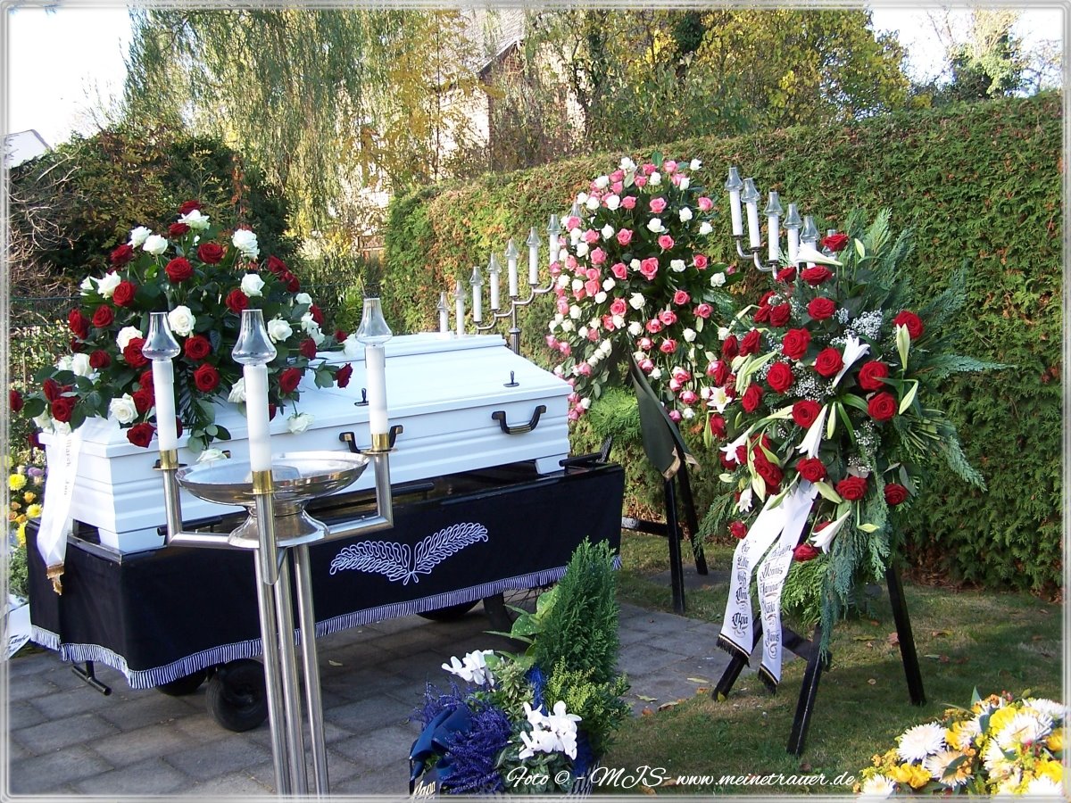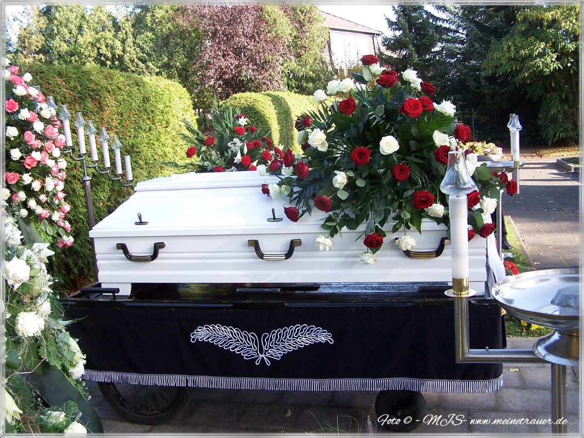 Ich erklärte ihm kurz anhand von einem Bild der Stelle auf dem Friedhof, wo der Sarg aufgebahrt wird. Er zeigte mir ein paar Bilder, welche Dekoration ich gerne haben könnte, so hatte ich direkt eine Vorstellung und habe eine schlichte Dekoration ausgesucht. Ich entschied mich, dass auf dem Sarg ein schönes Gesteck sein soll mit roten und weißen Rosen. Eine weiße Schleife mit goldener Schrift auf der stehen sollte: „In Liebe“ „Marek Jan“. Ich fühlte mich sehr gut aufgehoben und das erste Mal verstanden.