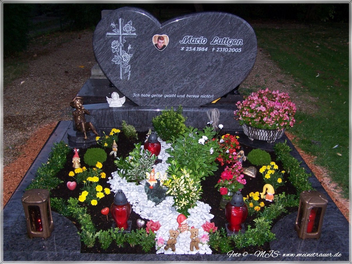 Statt nach Hause fuhr ich wieder zum Grab. Behutsam habe ich die Kränze von Grab genommen und neu daraufgelegt. Ich wollte, dass sie richtig liegen, warum, weiß ich nicht. Ich blieb noch einem Moment stehen, weinte und sagte zu Mario: „Jetzt haben wir einen Garten der Erinnerung, komm, wir fahren wieder nach Hause Kleiner!“ Zuhause angekommen legte ich mich auf unser Hochbett und unterhielt mich mit meinen Eltern bis ich irgendwann von Erschöpfung eingeschlafen bin. Beim Einschlafen verspürte ich eine warme, zärtliche Umarmung und so wusste ich, dass er jetzt bei mir ist.